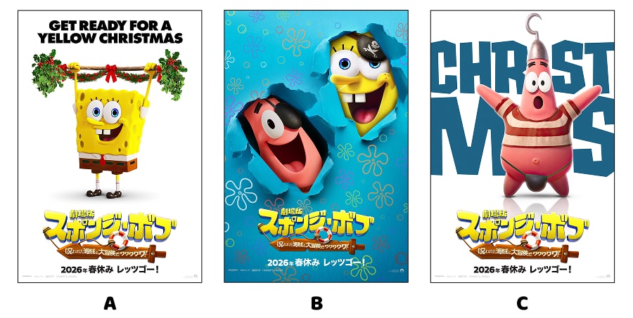 また、スポンジ・ボブからのクリスマスプレゼントとして解禁された3種の日本版クリスマスポスターは、ホリデーシーズンにぴったりな元気いっぱいのデザイン!スポンジ・ボブが赤と緑のリース飾りを掲げて満面の笑みを向け、もみの木並みにBIGになってしまったかのようなAパターン、スポンジ・ボブと親友のパトリックがそれぞれ眼帯をした海賊の装いでギフトラッピングをつき破る躍動感のたっぷりのBパターン、そしてパトリック自らが“Christmas”を堂々と全身で表現しているCパターンと、二人のキュートさがギュッとつまった楽しい日本版クリスマスポスターとなっています!